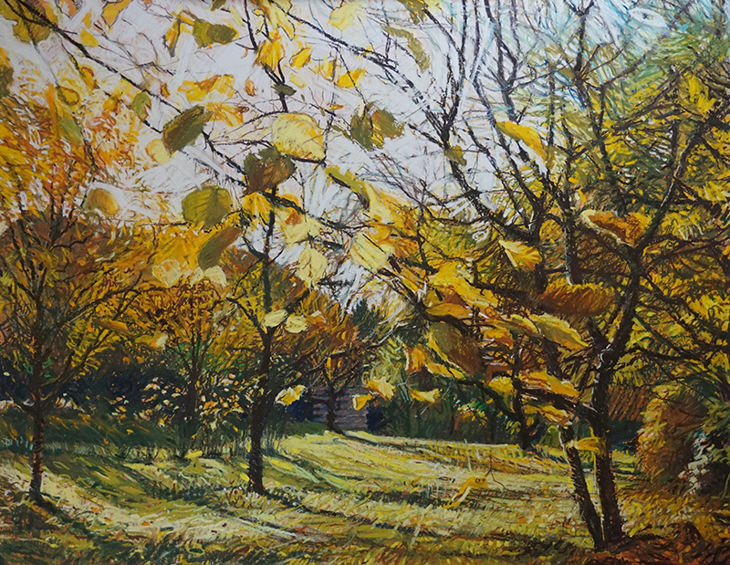 Stöckelerscher Obstgarten Nr. 3, Ölkreide auf Karton, 68x87 cm, 2017